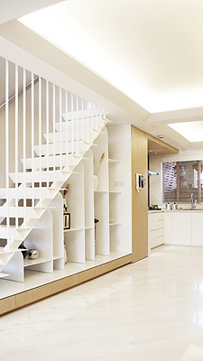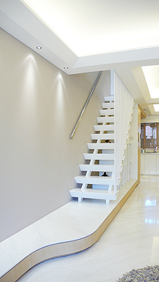 一樓至二樓的單跑階梯為輕質(zhì)的鋼結(jié)構(gòu)樓梯,設(shè)計上盡量簡潔并讓它感覺輕盈通透。鋼板踏步轉(zhuǎn)折至樓梯下方,將原本沒有功能的異性空間改造成造型感較強的展示空間。