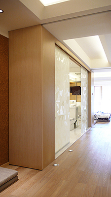 二樓衛(wèi)生間與過道的分隔墻采用白色的不透明夾膠玻璃,玻璃表面印制花紋。這樣的處理方式不但能夠節(jié)省空間,并能夠賦予原本較平淡的過渡空間更多的設(shè)計感。玻璃移門能夠左右移開,讓衛(wèi)生間與過道成為一個整體空間,增加戶型更加通透及開放的生活特性;